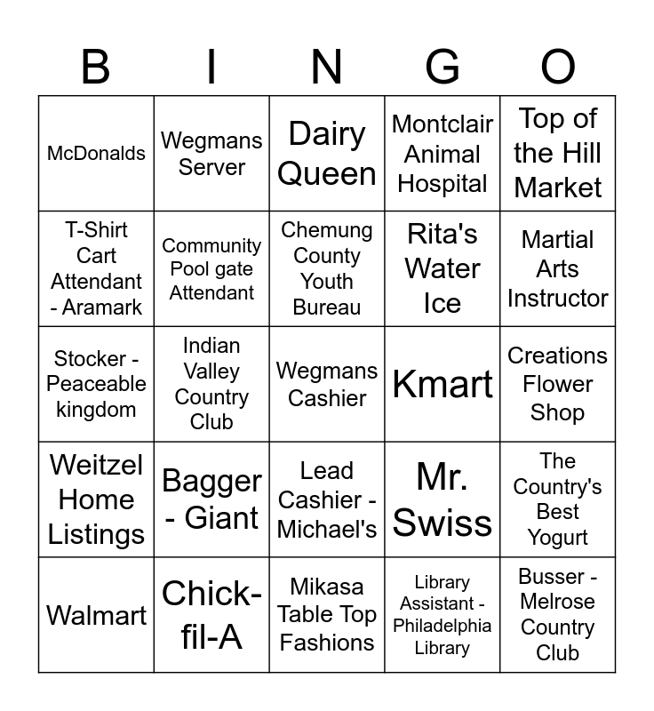 This bingo card has a free space and 24 words: Bagger - Giant, Chick-fil-A, Chemung County Youth Bureau, Walmart, Top of the Hill Market, McDonalds, T-Shirt Cart Attendant - Aramark, Wegmans Server, Kmart, Lead Cashier - Michael's, Rita's Water Ice, Stocker - Peaceable kingdom, Mr. Swiss, The Country's Best Yogurt, Community Pool gate Attendant, Library Assistant - Philadelphia Library, Creations Flower Shop, Dairy Queen, Martial Arts Instructor, Indian Valley Country Club, Busser - Melrose Country Club, Weitzel Home Listings, Montclair Animal Hospital and Mikasa Table Top Fashions.