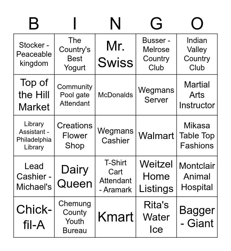 This bingo card has a free space and 24 words: Dairy Queen, Chemung County Youth Bureau, McDonalds, Chick-fil-A, Indian Valley Country Club, Stocker - Peaceable kingdom, Top of the Hill Market, The Country's Best Yogurt, Walmart, T-Shirt Cart Attendant - Aramark, Wegmans Server, Library Assistant - Philadelphia Library, Weitzel Home Listings, Montclair Animal Hospital, Community Pool gate Attendant, Rita's Water Ice, Mikasa Table Top Fashions, Mr. Swiss, Martial Arts Instructor, Creations Flower Shop, Bagger - Giant, Lead Cashier - Michael's, Busser - Melrose Country Club and Kmart.