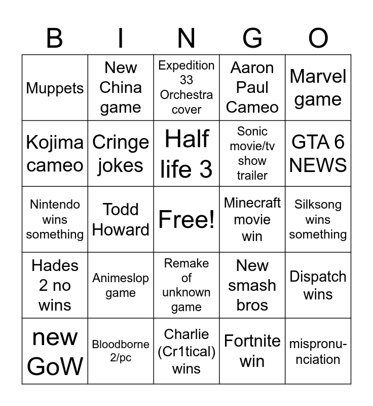 This bingo card has a free space and 24 words: Animeslop game, Bloodborne 2/pc, Half life 3, new GoW, Marvel game, Muppets, Kojima cameo, New China game, Minecraft movie win, Remake of unknown game, Sonic movie/tv show trailer, Nintendo wins something, New smash bros, Dispatch wins, Cringe jokes, Fortnite win, Silksong wins something, Expedition 33 Orchestra cover, GTA 6 NEWS, Todd Howard, mispronu- nciation, Hades 2 no wins, Aaron Paul Cameo and Charlie (Cr1tical) wins.