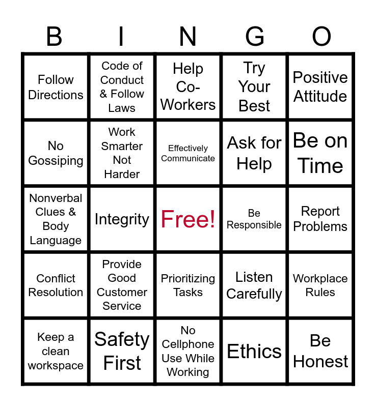 This bingo card has a free space and 25 words: Keep a clean workspace, Provide Good Customer Service, Effectively Communicate, Ethics, Be on Time, Follow Directions, Code of Conduct & Follow Laws, Help Co-Workers, Ask for Help, Workplace Rules, Nonverbal Clues & Body Language, Work Smarter Not Harder, Listen Carefully, Be Honest, No Gossiping, Safety First, No Cellphone Use While Working, Try Your Best, Report Problems, Conflict Resolution, Integrity, Prioritizing Tasks, Be Responsible, Positive Attitude and Communication.