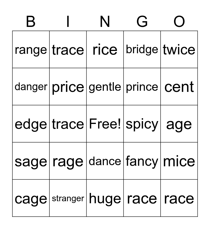 This bingo card has a free space and 29 words: cage, ice, trace, face, range, rice, price, rage, spicy, stranger, age, race, huge, race, cent, ranger, dance, sage, twice, edge, fancy, nice, prince, danger, bridge, trace, mice, gentle and gym.