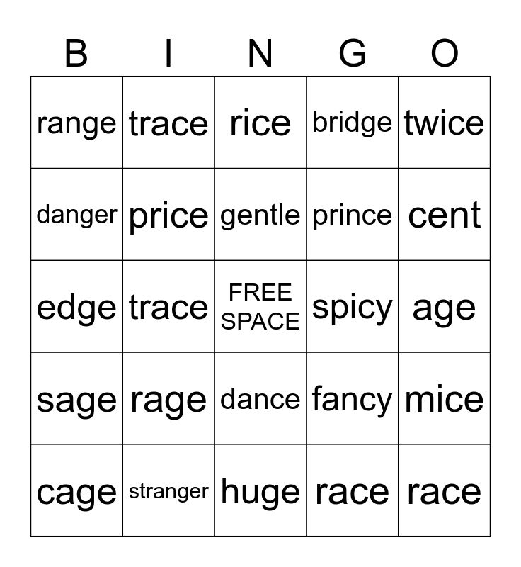 This bingo card has a free space and 29 words: cage, ice, trace, face, range, rice, price, rage, spicy, stranger, age, race, huge, race, cent, ranger, dance, sage, twice, edge, fancy, nice, prince, danger, bridge, trace, mice, gentle and gym.