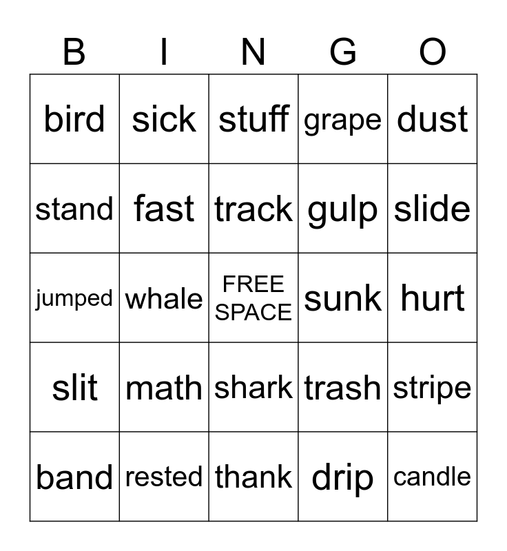 This bingo card has a free space and 34 words: drop, drip, crab, prop, slit, fast, dust, band, sick, snack, track, stuff, floss, hint, sunk, slide, rested, jumped, math, trash, shark, north, bird, hurt, thank, candle, grape, bunk, gulp, stand, trade, whale, stripe and pipe.