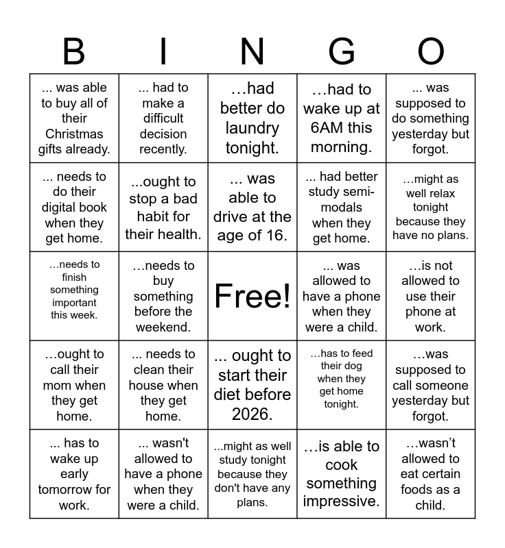 This bingo card has a free space and 24 words: ... needs to clean their house when they get home., ... wasn't allowed to have a phone when they were a child., ... was able to drive at the age of 16., ... has to wake up early tomorrow for work., ... was supposed to do something yesterday but forgot., ... was able to buy all of their Christmas gifts already., ... needs to do their digital book when they get home., ... had to make a difficult decision recently., ... was allowed to have a phone when they were a child., ... ought to start their diet before 2026., ... had better study semi-modals when they get home., …needs to finish something important this week., …has to feed their dog when they get home tonight., …was supposed to call someone yesterday but forgot., ...ought to stop a bad habit for their health., …is able to cook something impressive., …is not allowed to use their phone at work., …had better do laundry tonight., …might as well relax tonight because they have no plans., …needs to buy something before the weekend., …wasn’t allowed to eat certain foods as a child., …ought to call their mom when they get home., …had to wake up at 6AM this morning. and ...might as well study tonight because they don't have any plans..