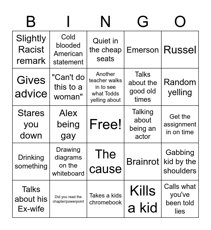 This bingo card has a free space and 34 words: Marvel!, Kills a kid, Puts on a video, Grading papers/tests, Drinking something, "Can't do this to a woman", Russel, Talks about his Ex-wife, Cold blooded American statement, Brings up political issue, Another teacher walks in to see what Todds yelling about, Quiet in the cheap seats, Gruesome explanation, Gets in someone's faces, Talking about being an actor, Random yelling, Did you read the chapter/powerpoint, Stares you down, Drawing diagrams on the whiteboard, Brainrot, The cause, Yelling at Ava, Slightly Racist remark, Get the assignment in on time, Takes a kids chromebook, Calls what you've been told lies, Emerson, Threatens to make us write facts, Talks about the good old times, Gives advice, Skips through powerpoint slides, Alex being gay, Gabbing kid by the shoulders and Gives advice exclusively for men.