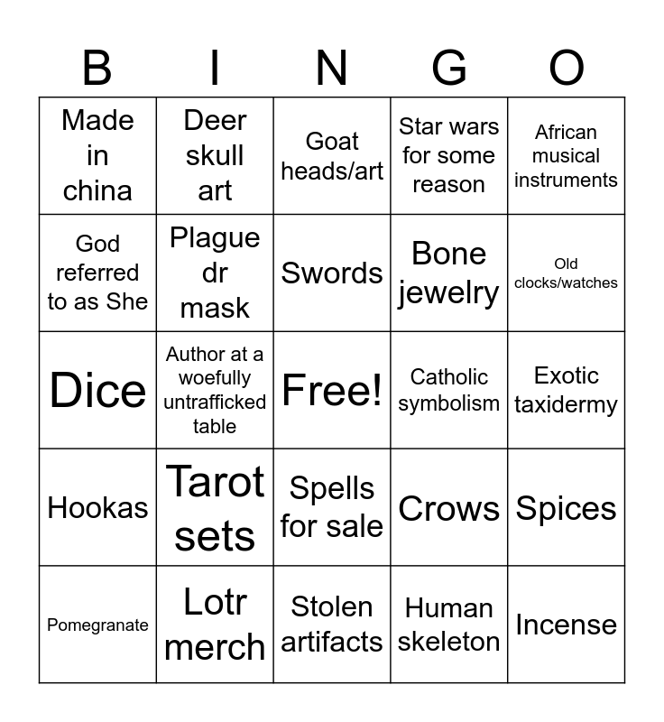 This bingo card has a free space and 24 words: Tarot sets, Lotr merch, Swords, Pomegranate, African musical instruments, Made in china, God referred to as She, Deer skull art, Catholic symbolism, Spells for sale, Bone jewelry, Dice, Crows, Spices, Plague dr mask, Human skeleton, Exotic taxidermy, Goat heads/art, Old clocks/watches, Author at a woefully untrafficked table, Incense, Hookas, Star wars for some reason and Stolen artifacts.