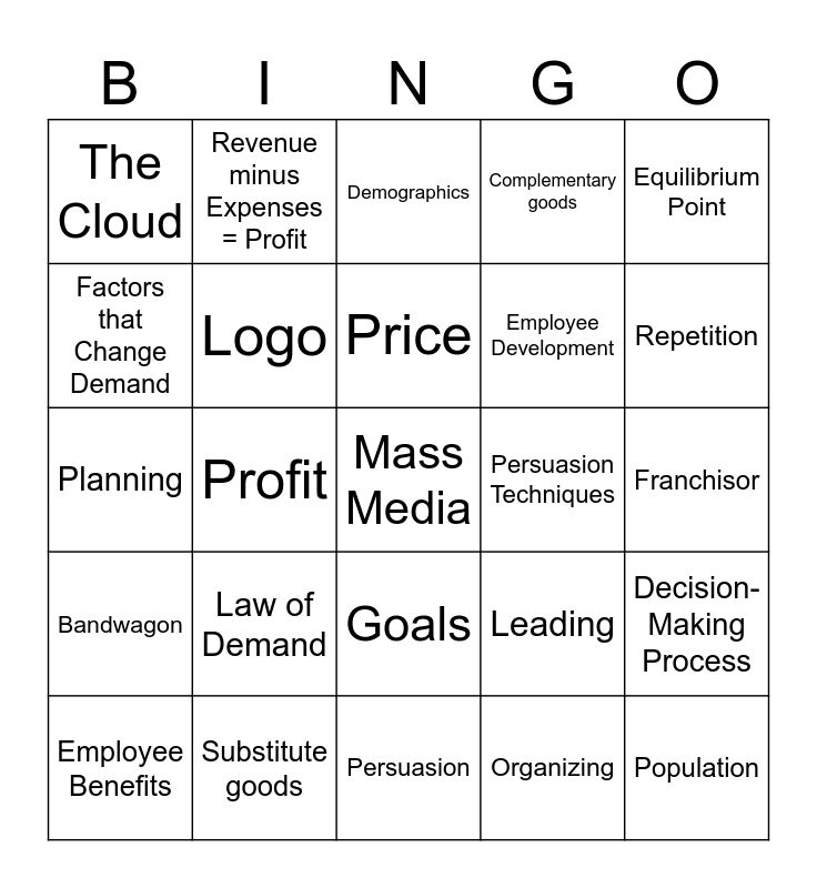 This bingo card has 108 words: Free!, Business, Profit, Revenue, Expenses, Role of a Business, Goods, Services, Competition, Consumer, Economics, Resources, Money, Labor, and Materials, Motive of Business, Economic Activity, Want or Need, Revenue minus Expenses = Profit, Limited Resources and Unlimited Wants, Burger King, A Bowling Alley, Law of Demand, Demand, Supply, Scarcity (Shortage), Surplus, Equilibrium Point, Factors that Change Demand, Complementary goods, Consumers' taste, Income, Population, Substitute goods, Peanut butter and jelly., Butter and vegetable oil., Medium, Demographics, Market, Market Research, Marketing, Mass Media, Target Market, Advertising, Persuasion, Price, Product, Place and Promotion, Demographics, Logo, Place, Price, Promotion, Persuasion Techniques, Slogan, Repetition, Bandwagon, Testimonial, Appeals to Emotion, Expert Opinion, Software, Hardware, Information Technology (IT), The Cloud, Technology, E-Commerce, Social Media, Succeed or fail, Short-term Goal, Long-term Goal, Organizational Structure, Decision-Making Process, Manager, Leading, Goals, Planning, Organizing, Vision Statement, Mission Statement, Objectives, Controlling, Management, Strategic, Tactical, Operational, Participative (Democratic) Leadership, Transformational Leadership, Transactional Leadership, Authoritarian (Autocratic) Leadership, Delegative (Laissez-Faire) Leadership, Situational (Strategic) Leadership, Improve Employee Performance, Title VII of the Civil Rights Act of 1964, Employee Performance Appraisal, Recruitment, Termination, Human Resource Management, Employee Development, Promotion, Incentive, Compensation, Americans with Disabilities Act (ADA), Affirmative Action, Employee Benefits, Employee Selection, Business Structure, Non-Profits, Sole Proprietorship, Partnership, Corporation, Limited Liability Corporation (LLC), Franchise, Franchisor and Franchisee.