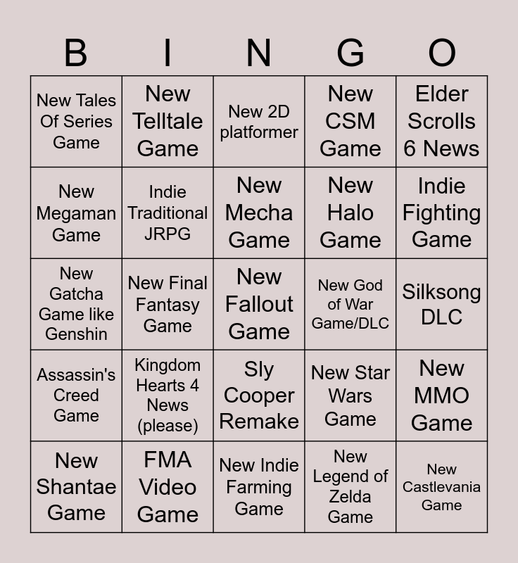 This bingo card has 25 words: Kingdom Hearts 4 News (please), New Indie Farming Game, New Mecha Game, New Shantae Game, Elder Scrolls 6 News, New Tales Of Series Game, New Megaman Game, New Telltale Game, New God of War Game/DLC, Sly Cooper Remake, New Halo Game, New Gatcha Game like Genshin, New Star Wars Game, New MMO Game, Indie Traditional JRPG, New Castlevania Game, Silksong DLC, New 2D platformer, Indie Fighting Game, New Final Fantasy Game, New Fallout Game, FMA Video Game, Assassin's Creed Game, New CSM Game and New Legend of Zelda Game.