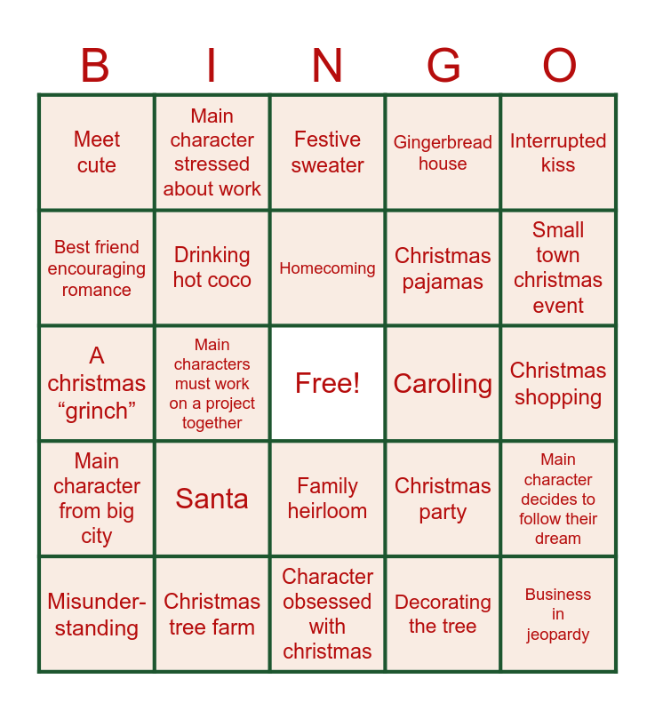 This bingo card has a free space and 34 words: Ice Skating, Decorating the tree, Holiday Baking, Long stare between couple, Main character from big city, Drinking hot coco, Interrupted kiss, Misunder- standing, Main character stressed about work, Enemies to lovers, Homecoming, Festive sweater, Christmas presents under the tree, The kiss, Caroling, Small town christmas event, Christmas tree farm, A christmas “grinch”, Santa, Christmas party, Family heirloom, Unexpectedly running into love interest, Meet cute, Christmas shopping, Character obsessed with christmas, Business in jeopardy, Gingerbread house, At a coffee shop, Christmas pajamas, Best friend encouraging romance, Love triangle, Main characters must work on a project together, Main character decides to follow their dream and Quirky older person giving advice.
