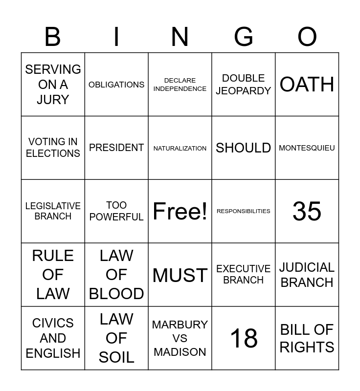 This bingo card has a free space and 24 words: LAW OF BLOOD, LAW OF SOIL, NATURALIZATION, CIVICS AND ENGLISH, OATH, SERVING ON A JURY, VOTING IN ELECTIONS, OBLIGATIONS, RESPONSIBILITIES, MUST, SHOULD, LEGISLATIVE BRANCH, EXECUTIVE BRANCH, JUDICIAL BRANCH, PRESIDENT, 18, 35, DECLARE INDEPENDENCE, MONTESQUIEU, TOO POWERFUL, BILL OF RIGHTS, RULE OF LAW, DOUBLE JEOPARDY and MARBURY VS MADISON.