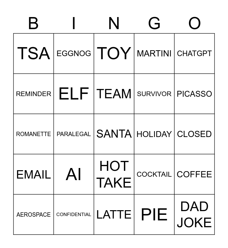 This bingo card has a free space and 24 words: AI, CONFIDENTIAL, TEAM, AEROSPACE, CHATGPT, TSA, REMINDER, EGGNOG, HOLIDAY, HOT TAKE, SURVIVOR, ROMANETTE, COCKTAIL, COFFEE, ELF, PIE, CLOSED, TOY, PICASSO, PARALEGAL, DAD JOKE, EMAIL, MARTINI and LATTE.