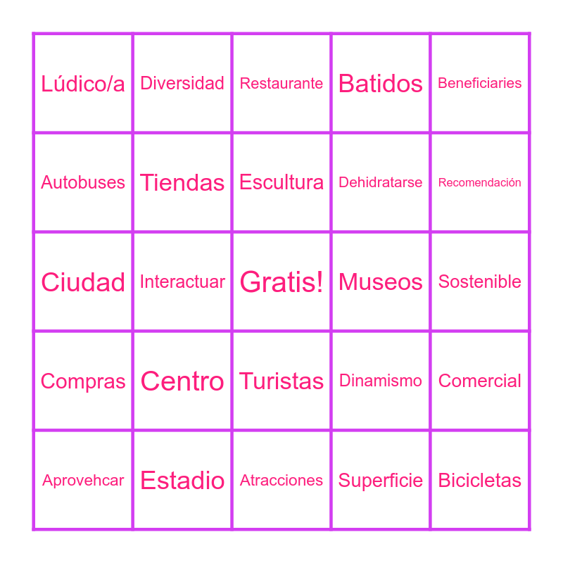 This bingo card has a free space and 24 words: Centro, Estadio, Escultura, Aprovehcar, Beneficiaries, Lúdico/a, Autobuses, Diversidad, Museos, Turistas, Dehidratarse, Ciudad, Dinamismo, Comercial, Tiendas, Superficie, Sostenible, Restaurante, Recomendación, Interactuar, Bicicletas, Compras, Batidos and Atracciones.
