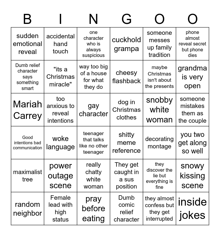This bingo card has 36 words: They get caught in a sus position, really chatty white woman, Dumb comic relief character, Dumb relief character says something smart, Good intentions bad communication, dog in Christmas clothes, "its a Christmas miracle", pray before eating, someone messes up family tradition, they discover the lie but everything is fine, grandma is very open, cuckhold grampa, snowy kissing scene, too anxious to reveal intentions, cheesy flashback, sudden emotional reveal, maximalist tree, snobby white woman, Mariah Carrey, one character who is always suspicious, gay character, woke language, shitty meme reference, teenager that talks like no other teenager, decorating montage, accidental hand touch, maybe Christmas isn't about the presents, Female lead with high status, way too big of a house for what they do, phone almost reveal secret but phone dies, inside jokes, random neighbor, you two get along so well, someone mistakes them as the couple, power outage scene and they almost confess but they get interrupted.