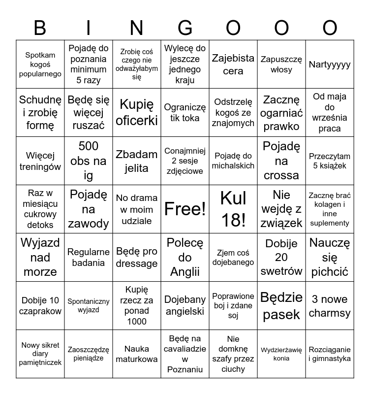 This bingo card has a free space and 48 words: Poprawione boj i zdane soj, Zacznę ogarniać prawko, Będę na cavaliadzie w Poznaniu, Pojadę na zawody, Zbadam jelita, Zacznę brać kolagen i inne suplementy, Pojadę do poznania minimum 5 razy, Zaoszczędzę pieniądze, Zapuszczę włosy, Polecę do Anglii, Nartyyyyy, Wylecę do jeszcze jednego kraju, Pojadę na crossa, Pojadę do michalskich, Dobije 10 czaprakow, Nie wejdę z związek, Schudnę i zrobię formę, Od maja do września praca, Będzie pasek, Zajebista cera, Odstrzelę kogoś ze znajomych, No drama w moim udziale, Spotkam kogoś popularnego, Będę się więcej ruszać, 3 nowe charmsy, Kupię oficerki, Przeczytam 5 książek, Nowy sikret diary pamiętniczek, Conajmniej 2 sesje zdjęciowe, 500 obs na ig, Wydzierżawię konia, Kul 18!, Nauczę się pichcić, Spontaniczny wyjazd, Raz w miesiącu cukrowy detoks, Zjem coś dojebanego, Dobije 20 swetrów, Więcej treningów, Będę pro dressage, Kupię rzecz za ponad 1000, Wyjazd nad morze, Rozciąganie i gimnastyka, Zrobię coś czego nie odważyłabym się, Nauka maturkowa, Ograniczę tik toka, Dojebany angielski, Regularne badania and Nie domknę szafy przez ciuchy.