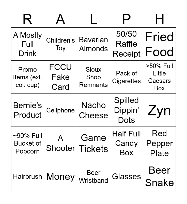 This bingo card has a free space and 24 words: A Shooter, Money, Sioux Shop Remnants, Hairbrush, Fried Food, A Mostly Full Drink, Promo Items (exl. col. cup), Children's Toy, Spilled Dippin' Dots, Game Tickets, Pack of Cigarettes, Bernie's Product, Half Full Candy Box, Red Pepper Plate, FCCU Fake Card, Glasses, Zyn, Bavarian Almonds, >50% Full Little Caesars Box, Cellphone, Beer Snake, ~90% Full Bucket of Popcorn, 50/50 Raffle Receipt and Beer Wristband.