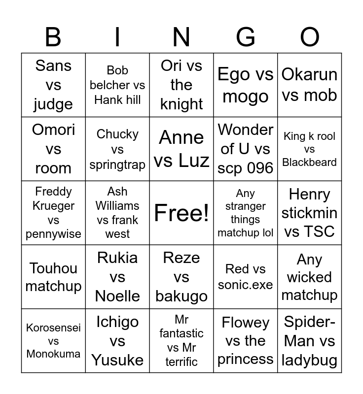 This bingo card has a free space and 24 words: Rukia vs Noelle, Ichigo vs Yusuke, Anne vs Luz, Korosensei vs Monokuma, Okarun vs mob, Sans vs judge, Omori vs room, Bob belcher vs Hank hill, Any stranger things matchup lol, Reze vs bakugo, Wonder of U vs scp 096, Freddy Krueger vs pennywise, Red vs sonic.exe, Any wicked matchup, Chucky vs springtrap, Flowey vs the princess, Henry stickmin vs TSC, Ori vs the knight, King k rool vs Blackbeard, Ash Williams vs frank west, Spider-Man vs ladybug, Touhou matchup, Ego vs mogo and Mr fantastic vs Mr terrific.