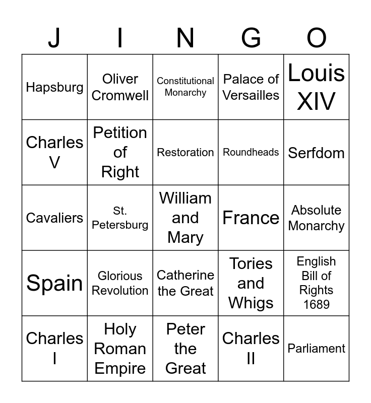 This bingo card has 25 words: Glorious Revolution, Peter the Great, Restoration, Charles I, Louis XIV, Hapsburg, Charles V, Oliver Cromwell, France, Catherine the Great, Roundheads, Cavaliers, Tories and Whigs, English Bill of Rights 1689, Petition of Right, Parliament, Absolute Monarchy, Constitutional Monarchy, Serfdom, St. Petersburg, William and Mary, Holy Roman Empire, Spain, Palace of Versailles and Charles II.