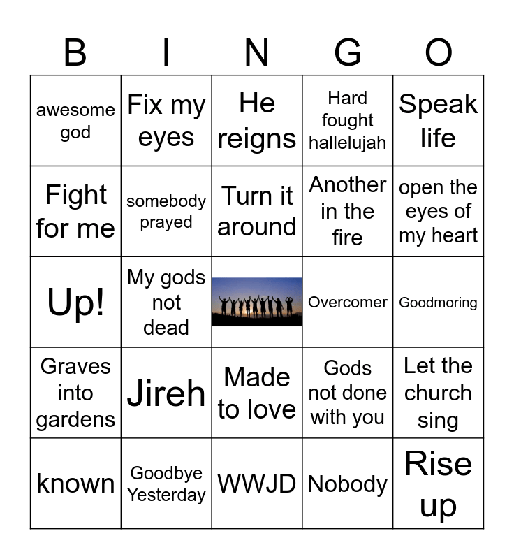 This bingo card has a free space and 87 words: Get Down, Jesus Freak, Made to love, Big House, Give me your eyes, Cartoon Network, Keep it simple, Hallelujah Everyday, Washed, Lemondae, Like David did, Dance like David, Let the church sing, Goodmoring, Believe in it, Turn it around, Your way Yahweh, Glory to the lord, Better days, Happy, Church clap, Might get loud, Up!, Not today, Nobody, Hallelujah, Praises, Good God Almighty, I’m so blessed, Alter, Goodbye Yesterday, My Jesus, Veggie tales, Jireh, Fight for me, God of wonders, open the eyes of my heart, This is amazing grace, God only knows, My gods not dead, Fighting for me, Raise a hallelujah, Free to be me, Overcomer, Happy dance, Speak life, Gods not dead, Fix my eyes, Hello my name is, Hero, waymaker, Goodness of God, Graves into gardens, Won’t he do it, This is amazing grace, That’s my king, Another in the fire, Your name is power, Dusty bibles, Hard fought hallelujah, somebody prayed, Brighter Days, The 99, Fear, In the room, Ill find you, 8:28, known, Rise up, Hold me, stronger, Born Again, He reigns, Gods not done with you, Grave.Robber, Promised land, The commission, WWJD, One Sixteen, The invasion, Me without you, Monster, Wake up sleeper, If i got Jesus, Your ways better, awesome god and Fly away.