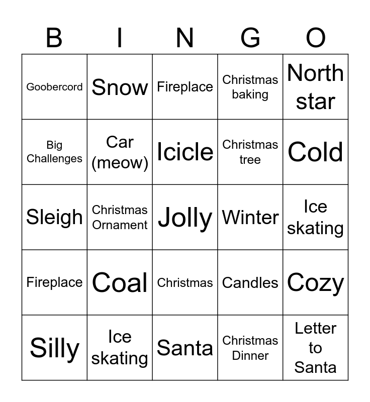 This bingo card has a free space and 24 words: Coal, Ice skating, Icicle, Silly, North star, Goobercord, Big Challenges, Snow, Winter, Christmas, Christmas tree, Sleigh, Candles, Cozy, Car (meow), Christmas Dinner, Ice skating, Fireplace, Cold, Christmas Ornament, Letter to Santa, Fireplace, Christmas baking and Santa.