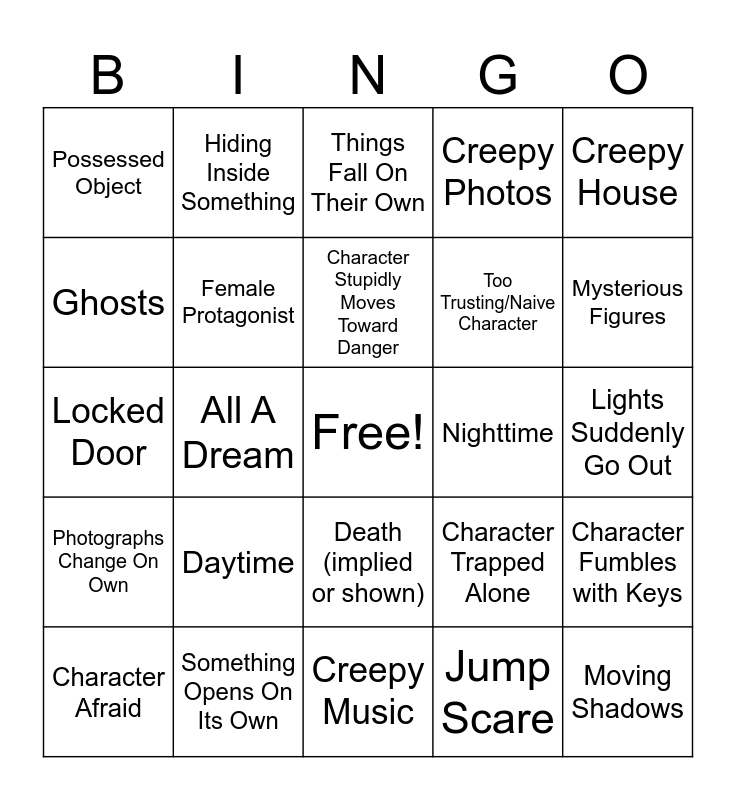 This bingo card has a free space and 26 words: Death (implied or shown), Jump Scare, Character Stupidly Moves Toward Danger, Something Opens On Its Own, Creepy House, Possessed Object, Ghosts, Hiding Inside Something, Lights Suddenly Go Out, Character Trapped Alone, Too Trusting/Naive Character, Locked Door, Character Fumbles with Keys, Character Afraid, All A Dream, Creepy Moans And Groans, Creepy Photos, Photographs Change On Own, Things Fall On Their Own, Moving Shadows, Mysterious Figures, Creepy Music, Nighttime, Daytime, Female Protagonist and Male Protagonist.