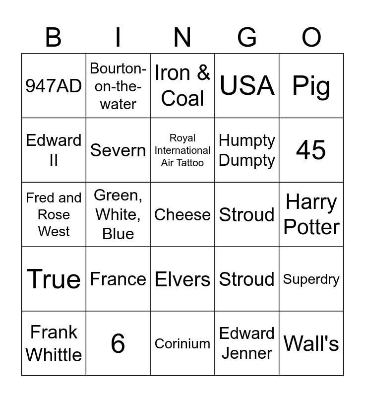 This bingo card has a free space and 24 words: France, 6, Royal International Air Tattoo, Frank Whittle, Pig, 947AD, Edward II, Bourton-on-the-water, Stroud, Elvers, Humpty Dumpty, Fred and Rose West, Stroud, Superdry, Severn, Edward Jenner, Harry Potter, Iron & Coal, 45, Green, White, Blue, Wall's, True, USA and Corinium.
