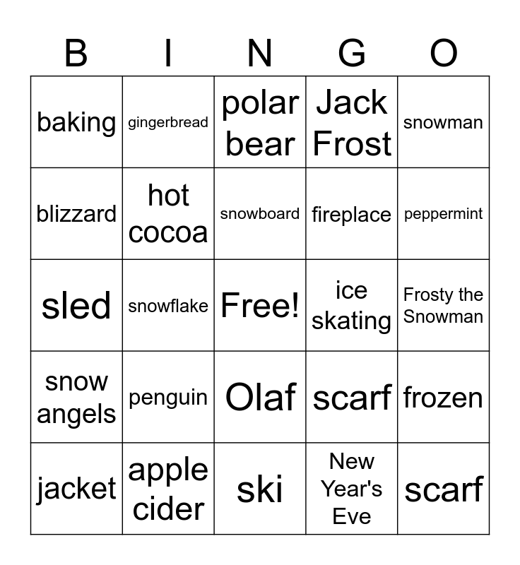 This bingo card has a free space and 25 words: penguin, ski, snowboard, jacket, snowman, baking, blizzard, gingerbread, ice skating, Olaf, fireplace, sled, scarf, frozen, hot cocoa, igloo, Frosty the Snowman, polar bear, peppermint, snowflake, scarf, apple cider, snow angels, Jack Frost and New Year's Eve.