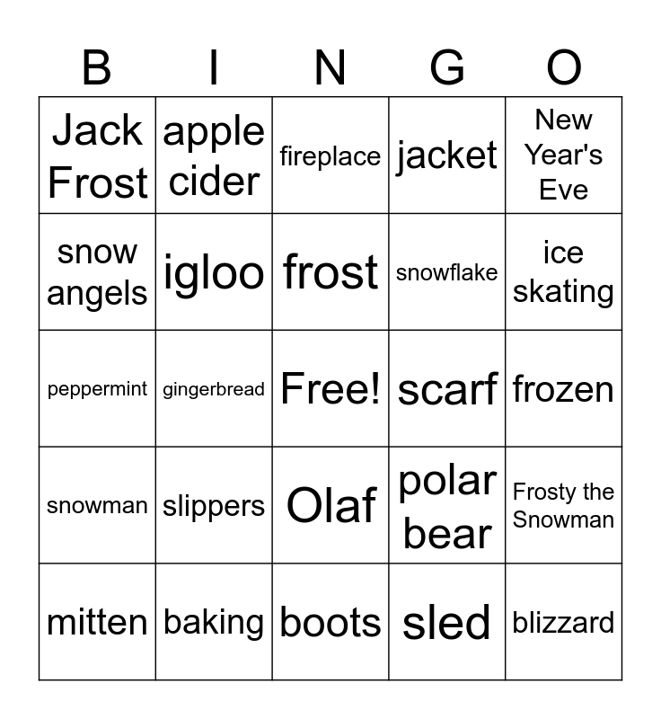 This bingo card has a free space and 25 words: slippers, boots, frost, mitten, New Year's Eve, Jack Frost, snow angels, apple cider, scarf, Olaf, snowflake, peppermint, polar bear, Frosty the Snowman, igloo, hot cocoa, frozen, fireplace, ice skating, gingerbread, blizzard, baking, snowman, jacket and sled.