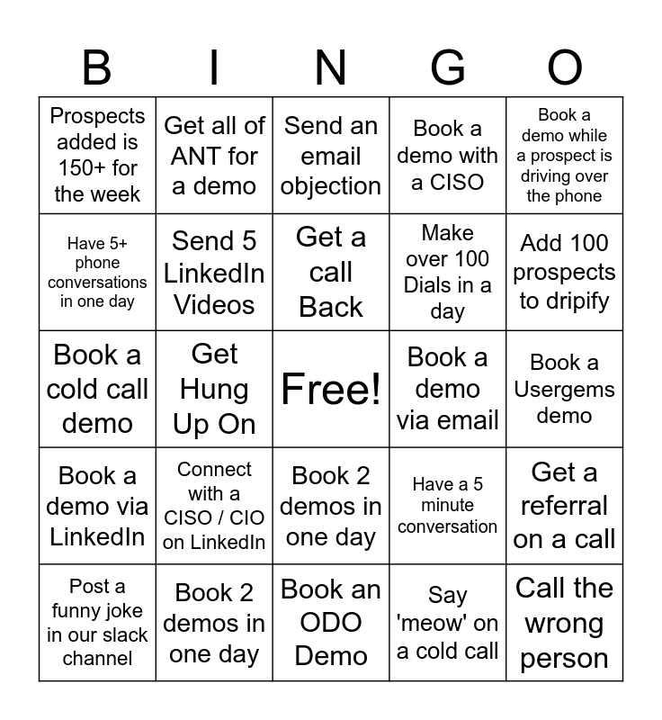 This bingo card has a free space and 24 words: Connect with a CISO / CIO on LinkedIn, Book 2 demos in one day, Get a call Back, Post a funny joke in our slack channel, Book a demo while a prospect is driving over the phone, Prospects added is 150+ for the week, Have 5+ phone conversations in one day, Get all of ANT for a demo, Book a demo via email, Book 2 demos in one day, Make over 100 Dials in a day, Book a cold call demo, Have a 5 minute conversation, Get a referral on a call, Send 5 LinkedIn Videos, Say 'meow' on a cold call, Book a Usergems demo, Send an email objection, Add 100 prospects to dripify, Get Hung Up On, Call the wrong person, Book a demo via LinkedIn, Book a demo with a CISO and Book an ODO Demo.