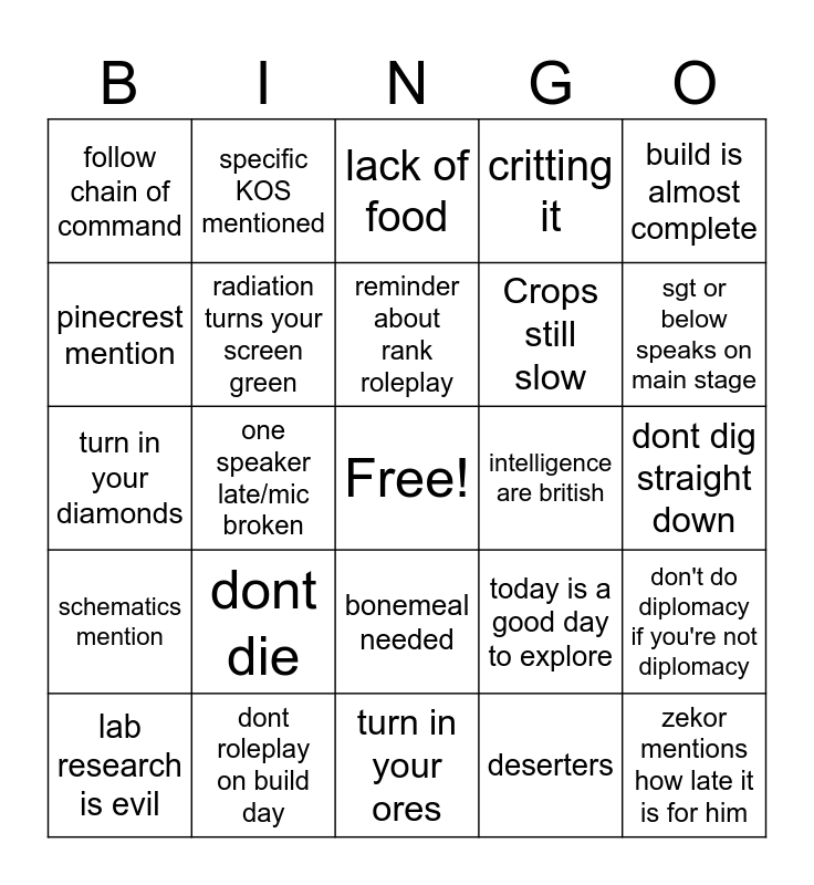 This bingo card has a free space and 24 words: dont die, dont roleplay on build day, reminder about rank roleplay, lab research is evil, build is almost complete, follow chain of command, pinecrest mention, specific KOS mentioned, intelligence are british, bonemeal needed, Crops still slow, turn in your diamonds, today is a good day to explore, don't do diplomacy if you're not diplomacy, radiation turns your screen green, deserters, dont dig straight down, lack of food, sgt or below speaks on main stage, one speaker late/mic broken, zekor mentions how late it is for him, schematics mention, critting it and turn in your ores.