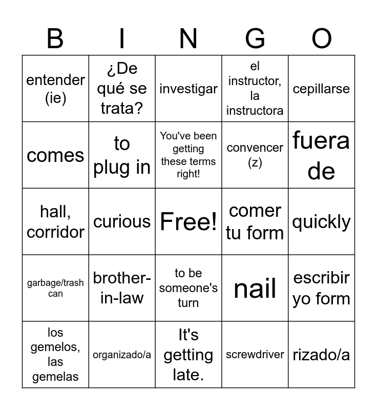 This bingo card has a free space and 441 words: A mí me tocan..., I get..., aparecer (zc), to appear, to turn up, darse prisa, to hurry, dedicar, to devote (time), fijarse, to notice, Pasándola., Getting by., pertenecer (zc), to belong, Se me hace tarde., It's getting late., vago/a, lazy, idle, Mastered (33), You've been getting these terms right!, Select these 33, ¡Chévere!, Great!, colaborar, to collaborate, el consejo estudiantil, student council, convencer (z), to convince, el coro, choir, depender de, to depend on, desaparecer (zc), to disappear, el ensayo, rehearsal, enseguida, right away, immediately, establecer (zc), to establish, estricto/a, strict, estudioso/a, studious, hacerse miembro, to become a member, harto/a (de), tired of, Igualmente., Me, too., merecer (zc), to deserve, motivado/a, motivated, ¡No es justo!, It's not fair!, ¡No hay quien lo/la aguante!, Nobody can stand him/her!, la nota, note, grade, obedecer (zc), to obey, organizado/a, organized, orgulloso/a, proud, la orquesta, orchestra, parecerse (zc), to resemble, to look like, prestar atención, to pay attention, rápido, quickly, reconocer (zc), to recognize, responsable, responsible, tal vez, maybe, talentoso/a, talented, gifted, tener confianza (en sí/ti mismo), to have self confidence, trabajador/a, hard working, activo/a, active, la actuación, performance, actuar, to act, atender (ie) (a la gente), to take care (of people), el atleta, la atleta, athlete, atlético/a, athletic, la aventura, action (film), el beisbolista, la beisbolista, baseball player, el ciclista, la ciclista, cyclist, la ciencia ficción, science fiction, cómico/a, comedy (film), con respecto a, regarding, curioso/a, curious, dar clases (de)..., to give...classes, ¿De qué se trata?, What is it about?, doblado/a, dubbed, el documental, documentary, el drama, drama, los efectos especiales, special effects, entender (ie), to understand, el entrenador, la entrenadora, trainer, coach, entrenarse, to train, el guión, pl. los guiones, script/scripts, hábil, skillful, el instructor, la instructora, instructor, investigar, to investigate, Me cae bien/mal., I like/don't like (someone or something)., montar en bicicleta, to ride a bicycle, el músico, la música, musician, el niñero, la niñera, baby sitter, No lo/la aguanto., I can't stand him/her/it., el oficio, trade, job, Para serte sincero/a..., To be honest..., pasear, to walk, to take a walk, policiaca, detective (film), por ahora, for now, la práctica, experience, reparar, to repair, el repartidor, la repartidora, delivery person, repartir, to deliver, romántico/a, romantic, sociable, sociable, friendly, los subtítulos, subtitles, el terror, horror (film), trabajar de..., to work as, los vaqueros, western, cowboy film, a diferencia de, unlike, contrary to, la barba, beard, el basurero, garbage/trash can, la calefacción, heating, el clavo, nail, el cuñado, brother-in-law, enchufar, to plug in, la madrina, godmother, el tornillo, screw, Mastered (33), You've been getting these terms right!, Select these 33, el bigote, mustache, la caja, box, casado/a, married, castaño/a, brown, clavar, to nail, conectar, to connect, construir (y), to build, el cortacésped, lawnmower, la cuñada, sister-in-law, decorar, to decorate, desarmar, to take apart, el destornillador, screwdriver, el detector de humo, smoke detector, el extinguidor de incendios, fire extinguisher, funcionar, to function, to work, los gemelos, las gemelas, twins, lacio, straight (hair), los lentes, eyeglasses, el martillo, hammer, la nuera, daughter-in-law, el padrino, godfather, el pasillo, hall, corridor, propio/a, one's own, regar (ie), to water, rizado/a, curly, sacar fotos, to take pictures, soltero/a, single, la suegra, mother-in-law, el suegro, father-in-law, la terraza, terrace, vaciar, to empty, viudo/a, widower, widow, widowed, el yerno, son-in-law, el colchón, mattress, la cómoda, dresser, chest of drawers, bureau, el cubrecama, bedcover, comforter, ponerse, to become, to get, Mastered (41), You've been getting these terms right!, Select these 41, acá, here, la almohada, pillow, cepillarse, to brush (one's hair, teeth), el cepillo de dientes, toothbrush, la cobija, blanket, compartir, to share, delante de, in front of, dentro de, inside of, el desorden, mess, desordenado/a, messy, la desventaja, disadvantage, detrás de, behind, enfrente de, facing, in front of, enojarse, to get angry, el esmalte de uñas, nail polish, el estante, shelving, bookcase, faltar, to be missing, fuera de, outside of, la funda, pillow case, furioso/a, furious, guardar, to put away, to keep, impaciente, impatient, el lápiz de labios, lipstick, mandón, mandona, bossy, la mesa de noche, night table, mojado/a, wet, numeroso/a, large (in numbers), ordenado/a, neat, paciente, patient, la pasta de dientes, toothpaste, pelearse, to fight, la percha, hanger, pintarse los labios (las uñas), to put on lipstick (to paint one's fingernails), prepararse, to prepare oneself, to get ready, la sábana, sheet, el secador, hair dryer, secarse, to dry (oneself), el sofá, sofa, el suelo, floor, tocar, to be someone's turn, la ventaja, advantage, Ser(tu), eras, Ser(Yo), soy, Ser(El,Ella), es, Ser(Nostros), somos, Ser(Ellos,Ellas), son, Estar(Yo), estoy, Estar(Tu), estás, Estar(El,Ella), está, Estar(Nosotros), estamos, Estar(Ellos,Ellas), están, ar, ir, er ending (yo), -o, ar ending (tu), -as, ar ending (el, ella), -a, ar ending (nosotros), -amos, ar ending (ellos, ellas), -an, ir, er ending (tu), -es, ir, er ending (el, ella), -e, ir, er ending (nosotros), -imos, ir, er ending (ellos, ellas), -en, hablar yo form, hablo, hablar tu form, hablas, hablar el, ella form, habla, hablar nosotros form, hablamos, hablar ellos, ellas, form, hablan, comer yo form, como, comer tu form, comes, comer el, ella form, come, comer nosotros form, comimos, comer ellos, ellas form, comen, pensar yo form, pienso, poder yo form, puedo, escribir yo form, escribo, es