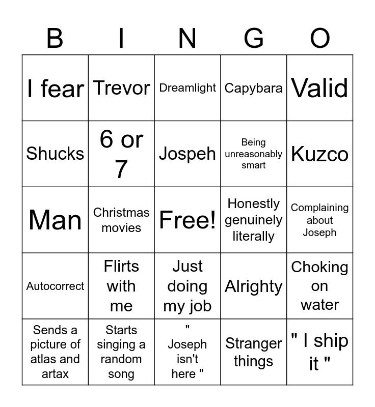 This bingo card has a free space and 24 words: Flirts with me, Starts singing a random song, Jospeh, Sends a picture of atlas and artax, Valid, I fear, Shucks, Trevor, Honestly genuinely literally, Just doing my job, Being unreasonably smart, Man, Alrighty, Choking on water, 6 or 7, Stranger things, Complaining about Joseph, Dreamlight, Kuzco, Christmas movies, " I ship it ", Autocorrect, Capybara and " Joseph isn't here ".