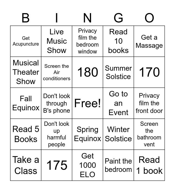 This bingo card has a free space and 24 words: Don't look up harmful people, 175, 180, Take a Class, Get a Massage, Get Acupuncture, Musical Theater Show, Live Music Show, Go to an Event, Spring Equinox, Summer Solstice, Fall Equinox, Winter Solstice, Screen the bathroom vent, Screen the Air conditioners, Paint the bedroom, Privacy film the front door, Privacy film the bedroom window, 170, Don't look through B's phone, Read 1 book, Read 5 Books, Read 10 books and Get 1000 ELO.