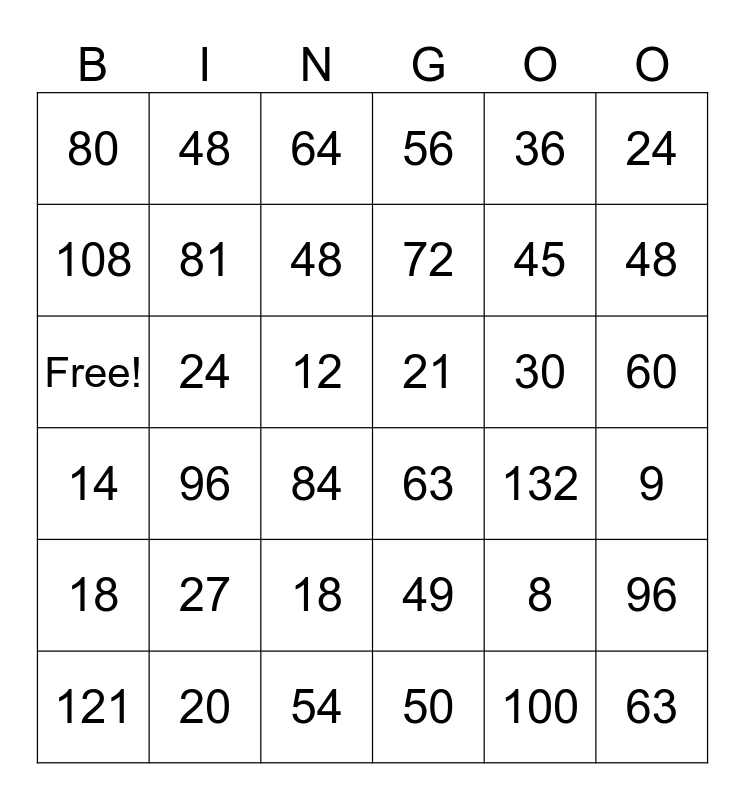This bingo card has 36 words: 49, 18, 50, 108, 14, 21, 81, 54, 36, 8, 48, 56, 96, 24, 72, 80, 18, 30, Free!, 64, 12, 96, 63, 84, 132, 48, 45, 20, 48, 24, 63, 121, 9, 60, 27 and 100.