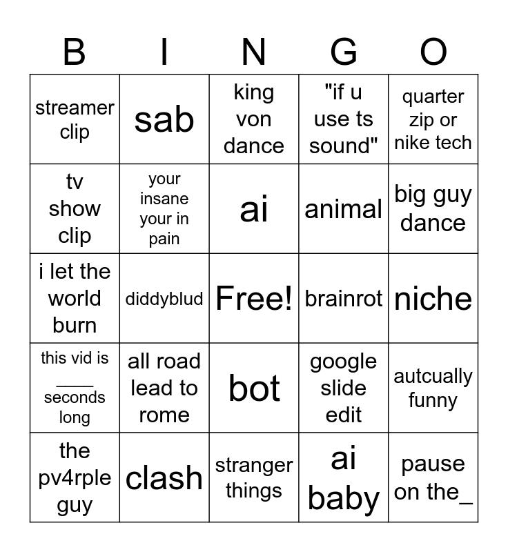 This bingo card has a free space and 24 words: all road lead to rome, clash, ai, the pv4rple guy, quarter zip or nike tech, streamer clip, tv show clip, sab, brainrot, bot, animal, i let the world burn, google slide edit, autcually funny, your insane your in pain, ai baby, niche, king von dance, big guy dance, diddyblud, pause on the_, this vid is ____ seconds long, "if u use ts sound" and stranger things.