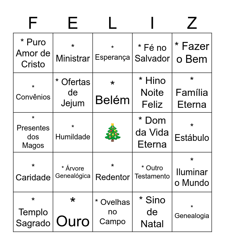 This bingo card has a free space and 90 words: * Jesus Cristo, * O Salvador, * Redentor, * Príncipe da Paz, * Luz do Mundo, * Emanuel, * Filho de Deus, * O Messias, * Cordeiro de Deus, * Maria, * José, * Menino Jesus, * Manjedoura, * Estábulo, * Lugar na Estalagem, * Belém, * Cidade de Davi, * Estrela Guia, * Anjo Gabriel, * Hostes Celestiais, * Glória a Deus, * Pastores, * Ovelhas no Campo, * Reis Magos, * Presentes dos Magos, * Ouro, * Incenso, * Mirra, * Lucas Capítulo 2, * Profecias, * Seja a Luz do Mundo, * Iluminar o Mundo, * Serviço ao Próximo, * Caridade, * Puro Amor de Cristo, * Fé no Salvador, * Esperança, * Gratidão, * Humildade, * Família Eterna, * Templo Sagrado, * Convênios, * Escrituras, * Bíblia Sagrada, * O Livro de Mórmon, * Outro Testamento, * Profeta Vivo, * Primeira Presidência, * Conferência de Natal, * Devocional de Natal, * Hinos de Natal, * Hino Noite Feliz, * Hino Vinde Adoremos, * Oração em Família, * Noite Familiar, * Espírito Santo, * Dom da Vida Eterna, * Plano de Salvação, * Testemunho de Cristo, * Unidade da Ala, * Irmãos e Irmãs, * Ajudar os Necessitados, * Partilhar o Evangelho, * Vinde a Mim, * Paz na Terra, * Boa Vontade, * Alegria, * Sino de Natal, * Guirlanda, * Luzes de Natal, * Árvore Genealógica, * Genealogia, * Registros de Família, * Perdão, * Ministrar, * Ofertas de Jejum, * Sociedade de Socorro, * Quórum do Sacerdócio, * Primária, * Moças, * Rapazes, * Fazer o Bem, * Natal, * Nascimento, * Espírito Natalino, * Élder, * Missão, * Bispo, * Presépio and * Adoração.