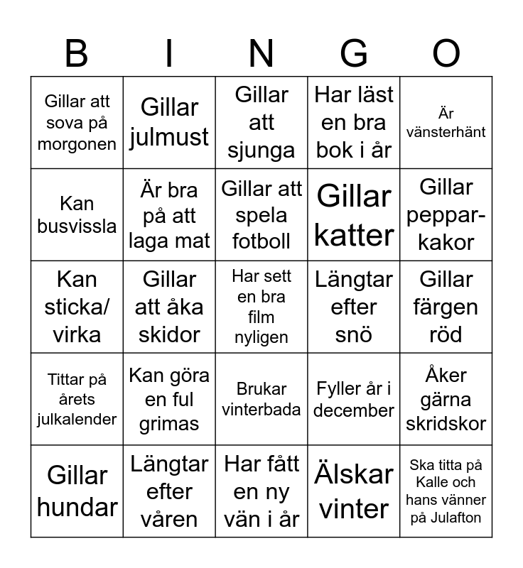 This bingo card has 25 words: Kan göra en ful grimas, Har fått en ny vän i år, Gillar att spela fotboll, Gillar hundar, Är vänsterhänt, Gillar att sova på morgonen, Kan busvissla, Gillar julmust, Längtar efter snö, Brukar vinterbada, Gillar katter, Kan sticka/ virka, Fyller år i december, Åker gärna skridskor, Är bra på att laga mat, Ska titta på Kalle och hans vänner på Julafton, Gillar färgen röd, Gillar att sjunga, Gillar peppar-kakor, Gillar att åka skidor, Har sett en bra film nyligen, Längtar efter våren, Tittar på årets julkalender, Har läst en bra bok i år and Älskar vinter.