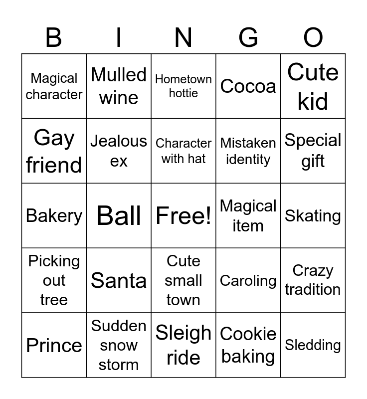 This bingo card has a free space and 29 words: Prince, Snow, Ball, Tree decorating, Magical character, Hometown hottie, Jealous ex, Santa, Magical item, Sudden snow storm, Skating, Sledding, Sleigh ride, Cookie baking, Special gift, Character with dead parent, Cute small town, Picking out tree, Cute kid, Bakery, Caroling, Xmas lights, Mistaken identity, Gay friend, Cocoa, Mulled wine, Crazy tradition, Character with hat and Opening gifts.