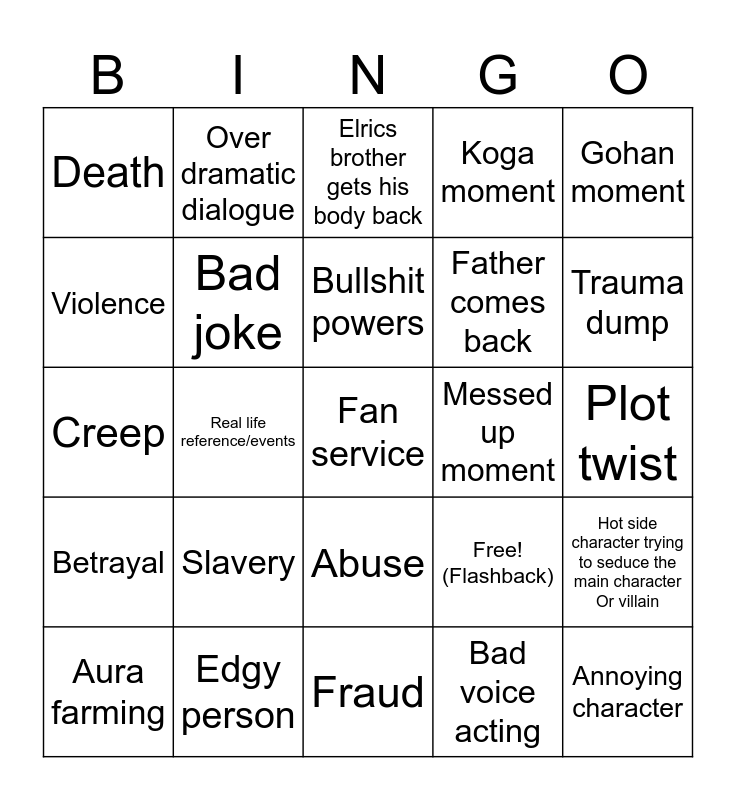 This bingo card has 25 words: Slavery, Fraud, Bullshit powers, Aura farming, Gohan moment, Death, Violence, Over dramatic dialogue, Messed up moment, Abuse, Father comes back, Creep, Free! (Flashback), Hot side character trying to seduce the main character Or villain, Bad joke, Annoying character, Plot twist, Elrics brother gets his body back, Trauma dump, Real life reference/events, Fan service, Edgy person, Betrayal, Koga moment and Bad voice acting.