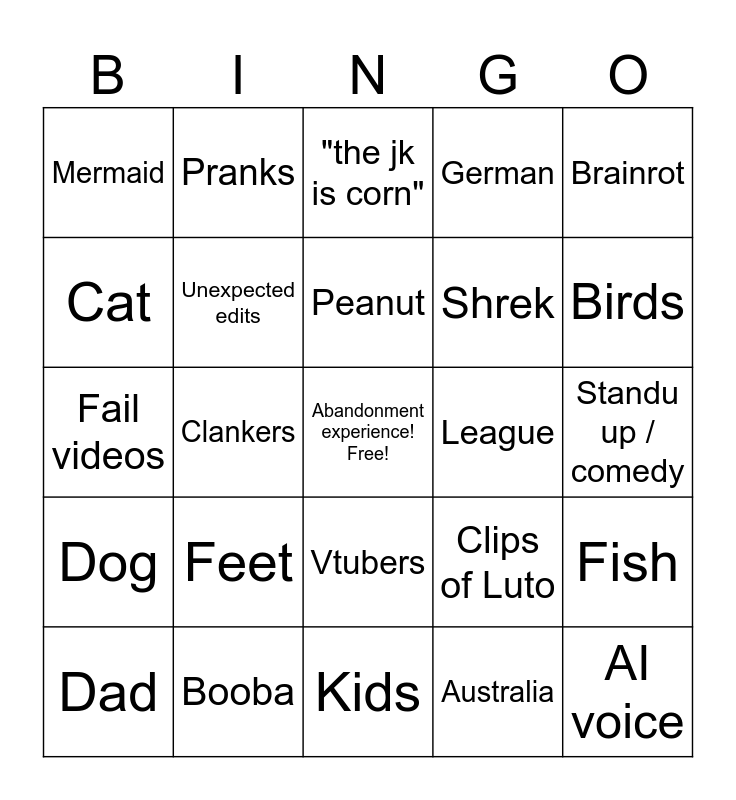 This bingo card has a free space and 24 words: Feet, Booba, Peanut, Dad, Brainrot, Mermaid, Cat, Pranks, League, Vtubers, Shrek, Fail videos, Clips of Luto, Fish, Unexpected edits, Australia, Standu up / comedy, "the jk is corn", Birds, Clankers, AI voice, Dog, German and Kids.