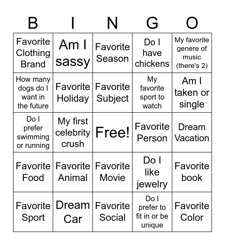 This bingo card has a free space and 29 words: Favorite Sport, Favorite Hobby, My first celebrity crush, Dream career, Favorite Clothing Brand, Favorite Season, Favorite Holiday, Favorite Animal, Favorite Person, Dream Car, Dream Vacation, Favorite Color, Favorite Social, Do I prefer to fit in or be unique, Am I taken or single, Favorite Singer, Favorite Movie, Favorite Food, My favorite genere of music (there's 2), Do I prefer swimming or running, Do I like jewelry, Whats my favorite day, My favorite sport to watch, How many dogs do I want in the future, Do I have chickens, Am I sassy, Favorite book, Favorite Subject and Am I a midnighter?.