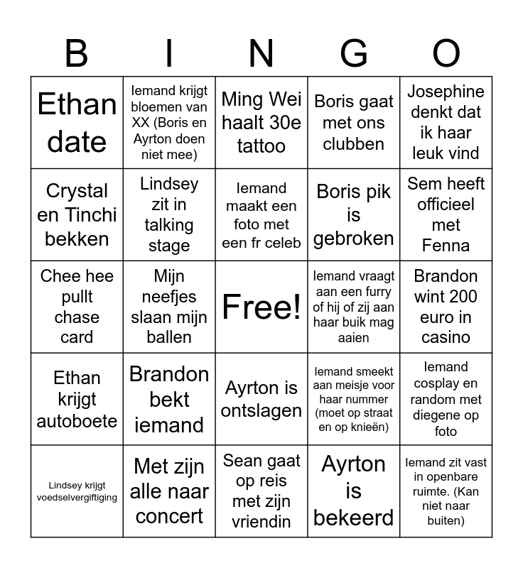 This bingo card has a free space and 24 words: Brandon bekt iemand, Met zijn alle naar concert, Iemand maakt een foto met een fr celeb, Lindsey krijgt voedselvergiftiging, Josephine denkt dat ik haar leuk vind, Ethan date, Crystal en Tinchi bekken, Iemand krijgt bloemen van XX (Boris en Ayrton doen niet mee), Iemand vraagt aan een furry of hij of zij aan haar buik mag aaien, Ayrton is ontslagen, Boris pik is gebroken, Chee hee pullt chase card, Iemand smeekt aan meisje voor haar nummer (moet op straat en op knieën), Iemand cosplay en random met diegene op foto, Lindsey zit in talking stage, Ayrton is bekeerd, Brandon wint 200 euro in casino, Ming Wei haalt 30e tattoo, Sem heeft officieel met Fenna, Mijn neefjes slaan mijn ballen, Iemand zit vast in openbare ruimte. (Kan niet naar buiten), Ethan krijgt autoboete, Boris gaat met ons clubben and Sean gaat op reis met zijn vriendin.