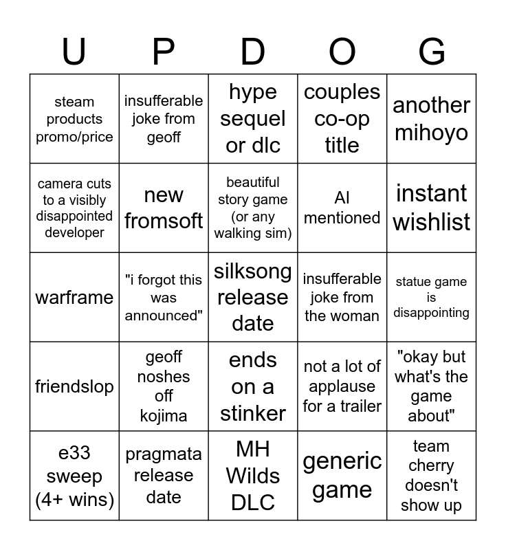 This bingo card has 1 images, a free space and 24 words: geoff noshes off kojima, pragmata release date, beautiful story game (or any walking sim), e33 sweep (4+ wins), another mihoyo, steam products promo/price, camera cuts to a visibly disappointed developer, insufferable joke from geoff, insufferable joke from the woman, ends on a stinker, AI mentioned, warframe, not a lot of applause for a trailer, "okay but what's the game about", new fromsoft, generic game, statue game is disappointing, hype sequel or dlc, instant wishlist, "i forgot this was announced", team cherry doesn't show up, friendslop, couples co-op title and MH Wilds DLC.