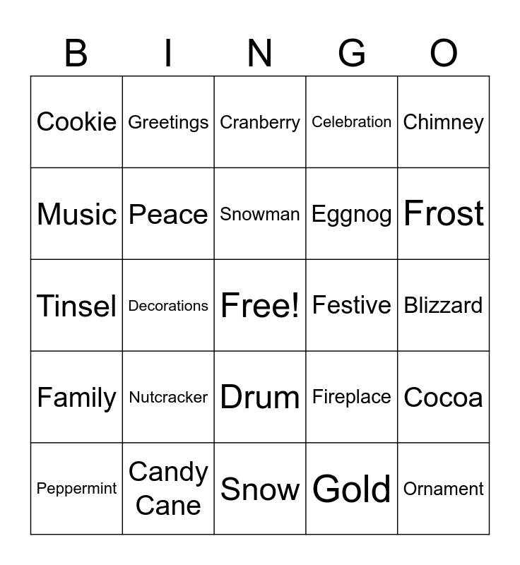 This bingo card has a free space and 70 words: Bells, Blizzard, Bow, Candle, Candy Cane, Carol, Celebration, Challah, Chimney, Chocolate, Cocoa, Comet, Cookie, Cranberry, December, Decorations, Drum, Eggnog, Evergreen, Family, Festive, Fireplace, Frost, Garland, Gelt, Gift, Gingerbread, Glitter, Gold, Goodwill, Greetings, Holly, Icicle, Joy, Lights, Magic, Menorah, Merry, Mittens, Music, North Pole, Nutcracker, Ornament, Package, Pageant, Peace, Peppermint, Pine, Poinsettia, Presents, Reindeer, Ribbon, Scarf, Silver, Snow, Snowflake, Snowman, Star, Stocking, Sweater, Tinsel, Toys, Tradition, Tree, Twinkle, Warmth, Winter, Wish, Wreath and Wrapping.