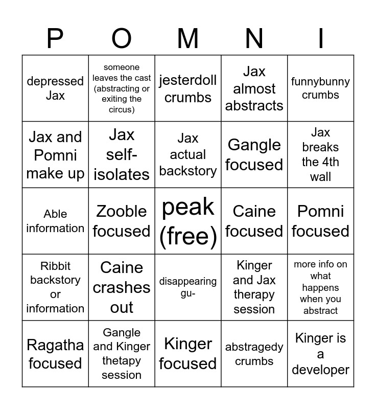 This bingo card has a free space and 24 words: Caine crashes out, Gangle and Kinger thetapy session, Jax actual backstory, Ragatha focused, funnybunny crumbs, depressed Jax, Jax and Pomni make up, someone leaves the cast (abstracting or exiting the circus), Caine focused, disappearing gu-, Gangle focused, Able information, Kinger and Jax therapy session, more info on what happens when you abstract, Jax self-isolates, abstragedy crumbs, Pomni focused, jesterdoll crumbs, Jax breaks the 4th wall, Zooble focused, Kinger is a developer, Ribbit backstory or information, Jax almost abstracts and Kinger focused.