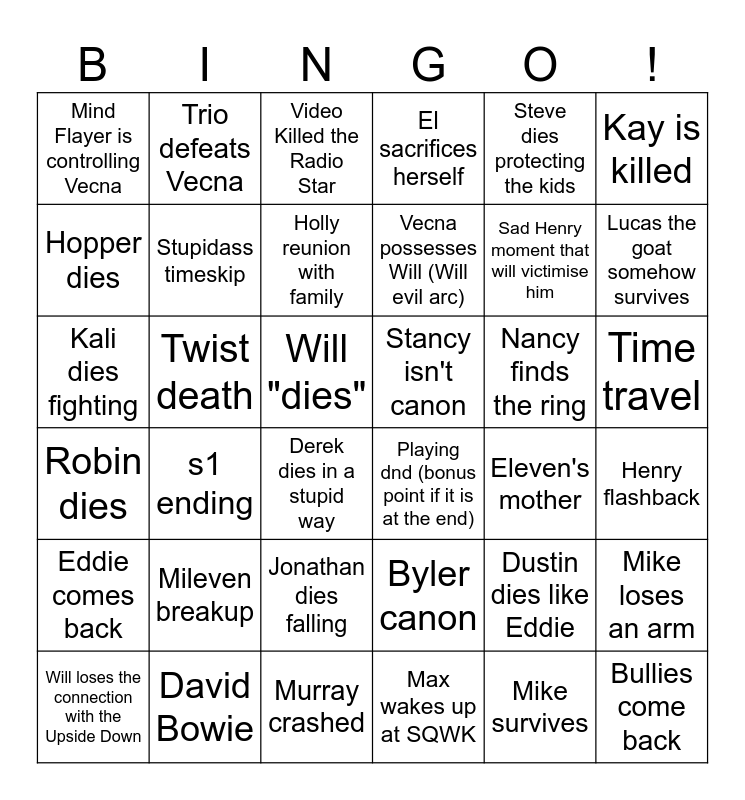 This bingo card has 36 words: Byler canon, Jonathan dies falling, Max wakes up at SQWK, Hopper dies, Robin dies, Stancy isn't canon, Stupidass timeskip, Murray crashed, Steve dies protecting the kids, Dustin dies like Eddie, Lucas the goat somehow survives, El sacrifices herself, Mike loses an arm, Twist death, Vecna possesses Will (Will evil arc), Mind Flayer is controlling Vecna, Eddie comes back, Nancy finds the ring, Kali dies fighting, Video Killed the Radio Star, Will "dies", s1 ending, Playing dnd (bonus point if it is at the end), Derek dies in a stupid way, Eleven's mother, Trio defeats Vecna, Sad Henry moment that will victimise him, David Bowie, Holly reunion with family, Kay is killed, Bullies come back, Will loses the connection with the Upside Down, Henry flashback, Time travel, Mileven breakup and Mike survives.