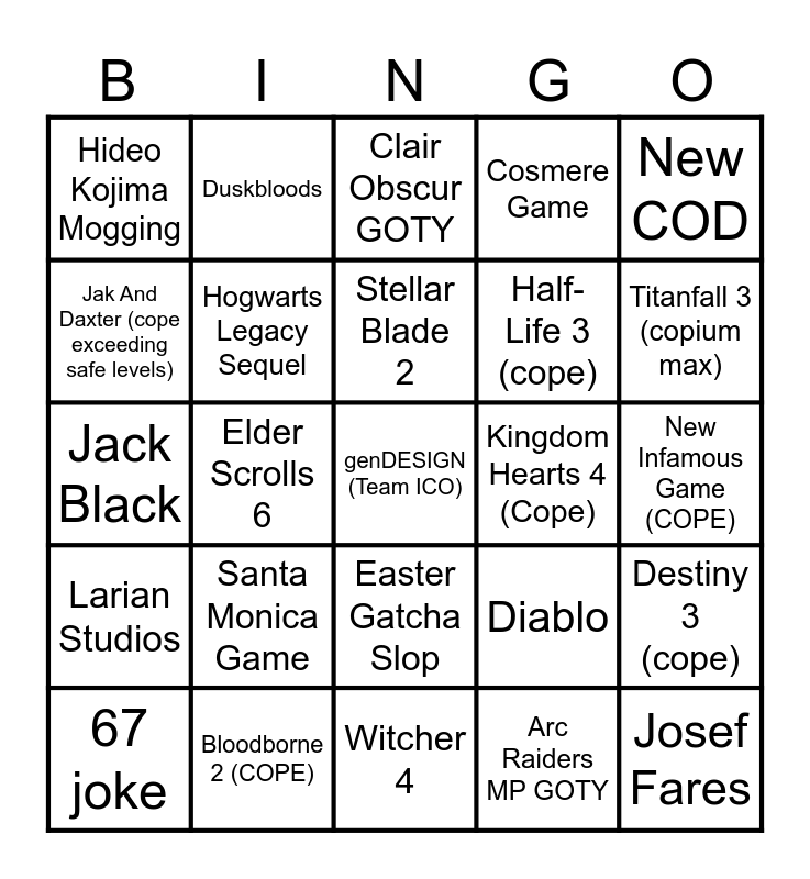 This bingo card has 25 words: Santa Monica Game, Witcher 4, Stellar Blade 2, 67 joke, New COD, Hideo Kojima Mogging, Jak And Daxter (cope exceeding safe levels), Duskbloods, Kingdom Hearts 4 (Cope), Easter Gatcha Slop, Half-Life 3 (cope), Jack Black, Diablo, Destiny 3 (cope), Hogwarts Legacy Sequel, Josef Fares, New Infamous Game (COPE), Clair Obscur GOTY, Titanfall 3 (copium max), Elder Scrolls 6, genDESIGN (Team ICO), Bloodborne 2 (COPE), Larian Studios, Cosmere Game and Arc Raiders MP GOTY.