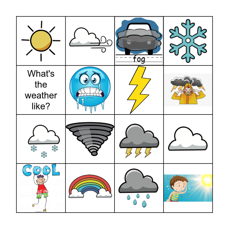 This bingo card has 15 images and 1 words: What's the weather like?.