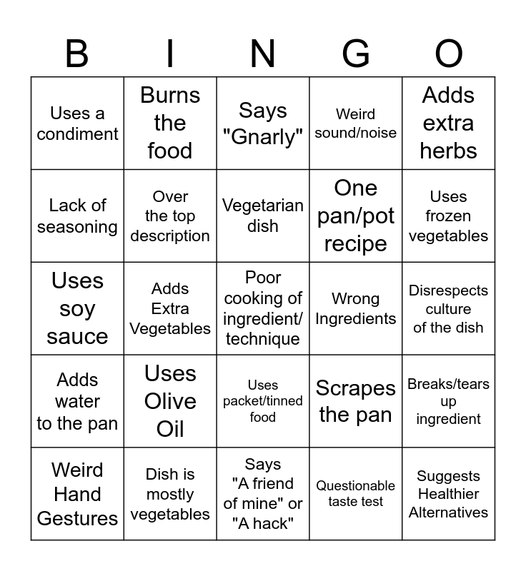 This bingo card has 29 words: Weird Hand Gestures, Uses Mango Chutney, Adds Extra Vegetables, Suggests Healthier Alternatives, Uses a condiment, Says "Gnarly", Over the top description, Uses Olive Oil, Wrong Ingredients, Dish is mostly vegetables, Disrespects culture of the dish, Poor cooking of ingredient/ technique, Says "A friend of mine" or "A hack", Questionable taste test, Uses frozen vegetables, Weird eating habit, Uses packet/tinned food, Adds water to the pan, Adds extra herbs, Uses soy sauce, Scrapes the pan, Calls the dish healthy, One pan/pot recipe, Lack of seasoning, Weird sound/noise, Burns the food, Breaks/tears up ingredient, Vegetarian dish and Adds nuts to the dish.