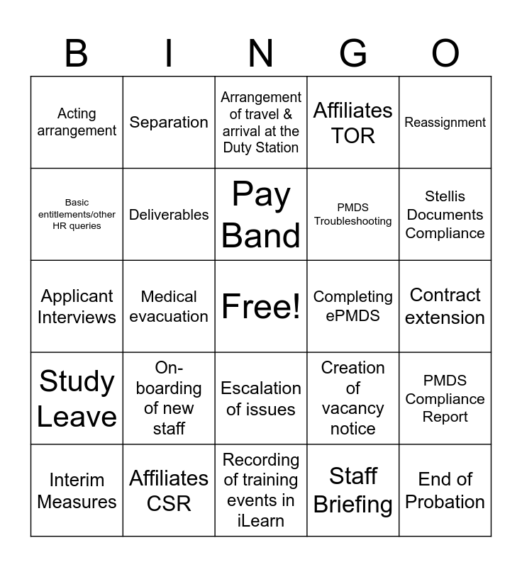 This bingo card has a free space and 24 words: On-boarding of new staff, Affiliates CSR, Pay Band, Interim Measures, Reassignment, Acting arrangement, Basic entitlements/other HR queries, Separation, Completing ePMDS, Escalation of issues, PMDS Troubleshooting, Applicant Interviews, Creation of vacancy notice, PMDS Compliance Report, Deliverables, Staff Briefing, Contract extension, Arrangement of travel & arrival at the Duty Station, Stellis Documents Compliance, Medical evacuation, End of Probation, Study Leave, Affiliates TOR and Recording of training events in iLearn.
