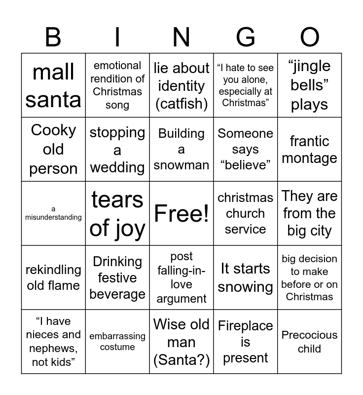This bingo card has a free space and 54 words: a proposal, rekindling old flame, accidental embrace from fall, enemy-to-lover, post falling-in-love argument, mistletoe kiss, “I hate to see you alone, especially at Christmas”, A kiss in the snow, Cooky old person, fake accent, mall santa, carolers, embarrassing costume, “I have nieces and nephews, not kids”, Cell phone business guy, Wise old man (Santa?), Precocious child, Someone says “believe”, The Local Grinch, They are from the big city, It starts snowing, out of place song choice, christmas church service, “jingle bells” plays, Holiday party, emotional rendition of Christmas song, Sitting around a family dinner, sleigh bells ringing, chime swipe, Fireplace is present, Someone mentions New York City, stressful corporate job, flight cancellation, last minute travel intervention, lie about identity (catfish), character 180, a misunderstanding, big decision to make before or on Christmas, Christmas heirloom, stopping a wedding, dead parent sob story, leave big city for small town or vice versa, decorating christmas cookies, Baking, Drinking festive beverage, Decorating a tree, Christmas story reading, Christmas Festival, Building a snowman, tears of joy, frantic montage, bad slow-mo, a “pan up” and someone wakes up with a full face of makeup.
